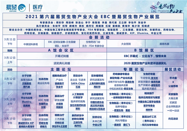 EBC易貿(mào)生物產(chǎn)業(yè)大會(huì)是中國規(guī)模最大、最具影響力的生物產(chǎn)業(yè)大會(huì)。2020年EBC參會(huì)人數(shù)2724人,2021年將突破4000人規(guī)模,參會(huì)人群覆蓋創(chuàng)業(yè)者、科學(xué)家、臨床醫(yī)生、投資人和供應(yīng)商等。同期開展的易貿(mào)生物產(chǎn)業(yè)展覽,將有超過200家儀器、耗材、服務(wù)等供應(yīng)商展出,會(huì)+展聯(lián)動(dòng)的EBC,已成為國內(nèi)外生物產(chǎn)業(yè)高層交流與合作的標(biāo)桿平臺(tái)。