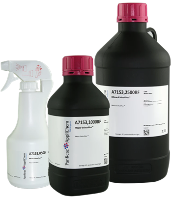 在mRNA疫苗的生產(chǎn)以及其他與mRNA相關(guān)的生物制品中,RNase污染的清除尤為重要,德國Applichem研發(fā)的RNase-ExitusPlus?是一種非堿性、無腐蝕性且無致癌性的新型RNase清除液,它對RNase污染物具有很好的清除性能,是適用于任何表面的即用型RNase污染清除液,可用于實驗室表面的清潔,如實驗操作臺、電泳設(shè)備、移液器和反應管等。