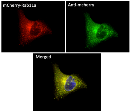 MCR細(xì)胞轉(zhuǎn)染表達(dá)mCherry-Rab11a后用甲醇固定并用1/250稀釋的anti-Rab11a抗體和anti-mCherry抗體做免疫熒光結(jié)果