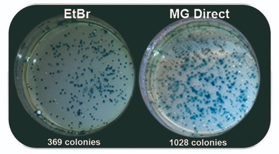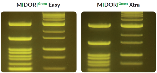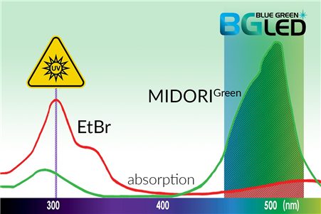 紫外光與EtBr染色至今仍一起被用于分子生物學(xué)實(shí)驗(yàn)室中檢測(cè)核酸。然而紫外光譜會(huì)導(dǎo)致DNA樣品的修飾和降解,30秒的紫外線曝光足以大幅降低克隆效率。藍(lán)/綠LED在470 nm - 520 nm處發(fā)出安全可見光,這種光譜對(duì) DNA 沒有破壞性,與紫外光相比,DNA完整性和克隆/測(cè)序效率完全不受影響,即使在長(zhǎng)時(shí)間的光照下也是如此。MIDORIGreen系列核酸染料經(jīng)過(guò)優(yōu)化,可在紫外光或藍(lán)/綠光激發(fā)時(shí)獲得更亮的信號(hào),同時(shí)也兼容紫外光。