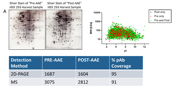 AAE-MS?也可以對(duì)藥物原液中HCPs富集的同時(shí)去除了大部分原料藥。去除原料藥極大地提高了通過(guò)2D-PAGE和質(zhì)譜分析識(shí)別單個(gè)HCPs的能力,因?yàn)樗幤吠ǔR?/span>104-106的倍數(shù)掩蓋HCPs。AAE-MS?是一種更客觀和直接的方法檢測(cè)和鑒定原料藥中任何潛在的HCPs雜質(zhì)以幫助優(yōu)化下游純化工藝。