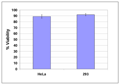 Fig 1?細(xì)胞活力檢測(cè):按照實(shí)驗(yàn)方案回收HeLa和293細(xì)胞培養(yǎng)6天,用臺(tái)盼藍(lán)法測(cè)定細(xì)胞活力。
