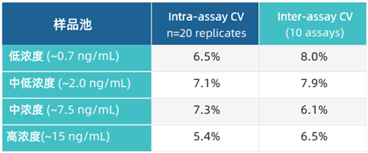 Precision evaluation (including intra-assay and inter-assay precision) was performed on 4 sample pools with known concentrations.